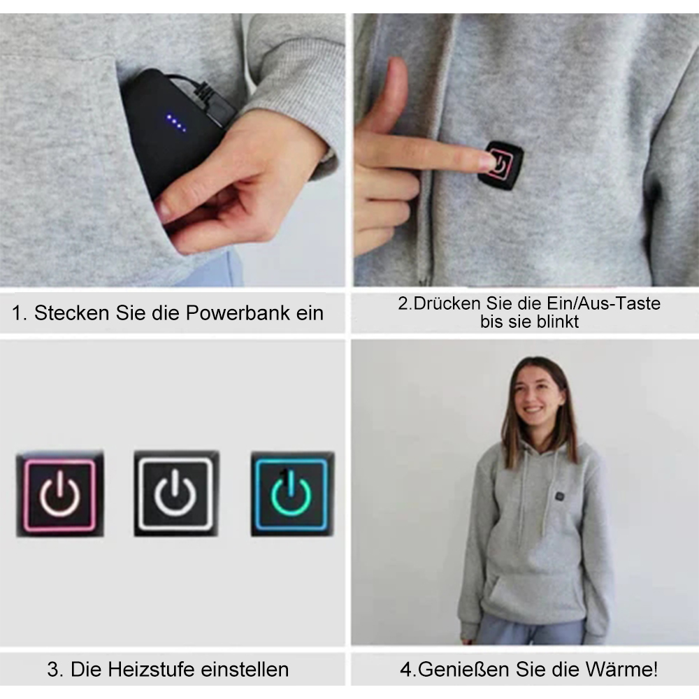 - Das beheizbare Sweatshirt kann auf 25°C, 35°C und 45°C erwärmt werden. Es kann mit einer Powerbank und einem USB-Kabel aufgeladen werden und hält Sie stundenlang angenehm warm.